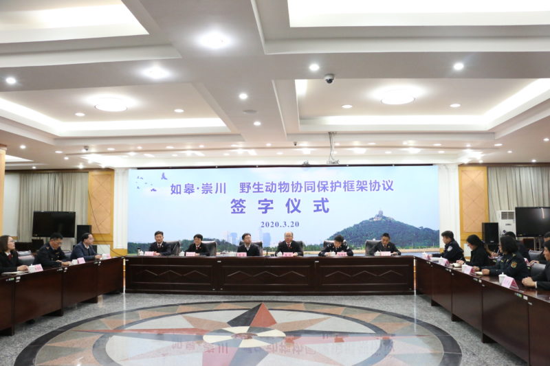 新如皋报讯    2020年3月20日下午,“如皋·祟川”野生动物协同保护框架协议签字仪式在崇川法院举行。南通中院党组成员、审判委员会专职委员高鸿,南通市崇川区政府常务副区长谭真,长江航运公安局南通分局孙德泉局长、如皋法院章智敏院长、崇川法院娄宏春院长、崇川检察院邹建华检察长以及崇川区公安局、司法局、农业农村局、市场监督局、综合执法局的主要负责人参加签字仪式。据悉,这是全省首个跨县域野生动物协同保护机制。