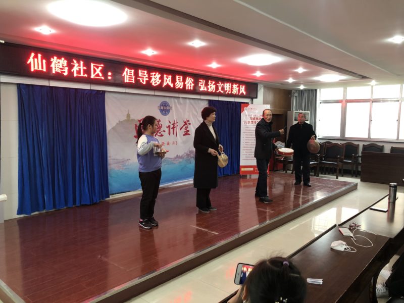 首先活动开始前播放了《移风易俗动漫宣传片》,宣传片深入剖析了大操大办、奢侈浪费等不良陋习带来的弊端,宣传婚事新办,丧事简办、小事不办的新理念。接着,如皋市文明家庭获得者张登余和大家一起分享了他的家庭故事。由社区党员自编、社区自导、群众自演的三句半《移风易俗新风尚》赢得了大家的阵阵掌声。仙鹤社区新时代文明实践站站长还宣读了《绿色清明 文明祭祀》倡议书。