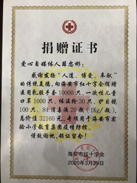 在捐赠仪式上,市委宣传部常务副部长刘万春、市教育体育局副局长祝和娟发表致辞,向情系新冠肺炎疫情防控的社会爱心人士,艺达框业创始人、海安自媒体人薛忠彬表示由衷的敬意和真诚的感谢!向全社会弘扬爱心企业和爱心人士责任担当、家国情怀和奉献精神,倡导全社会以实际行动支援疫情防控的主战场,相信在社会各界的关心关爱下定会为校园的开学提供更加安全,更加完善的复课条件,让学生们可以安心、安全的返回校园。