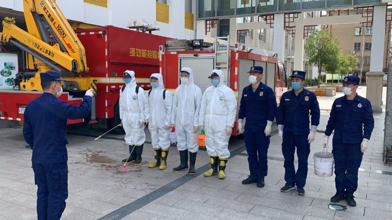 如皋市消防救援大队主动请战,对全市密集场所开展全面消杀、安全检查和消防宣传任务