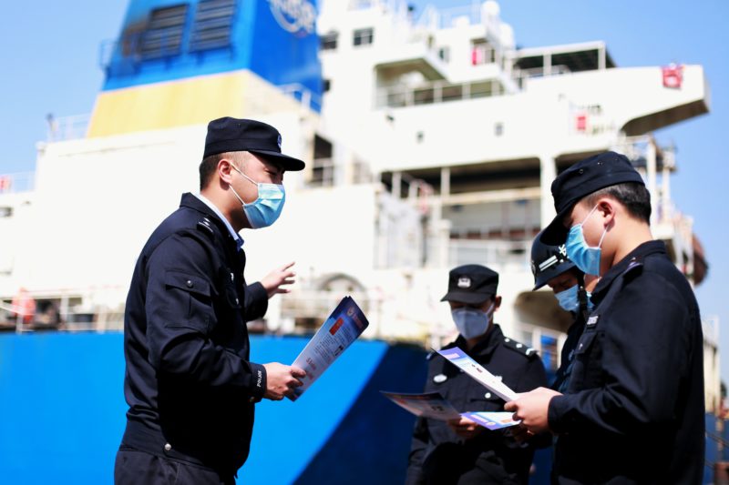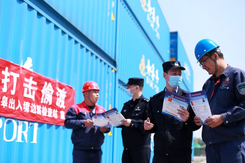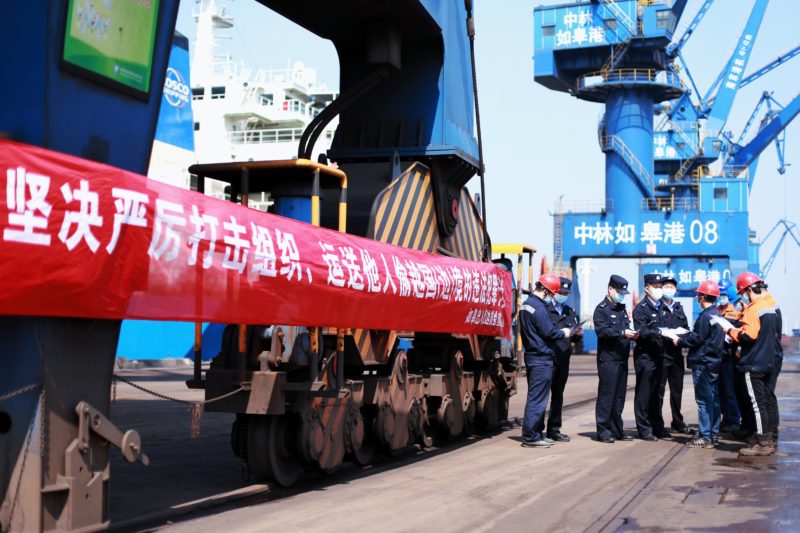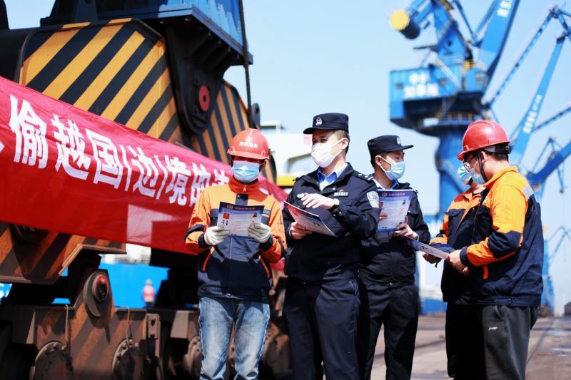 边检民警在集装箱码头进行反偷渡宣传
