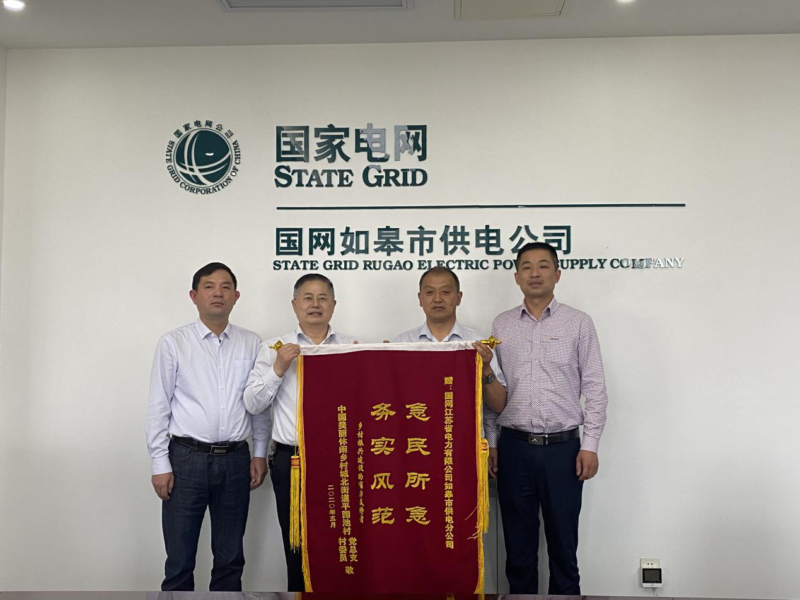 新如皋报讯 为感谢国网如皋市供电公司对如皋市城北街道平园池村电力保障、整改及旅游项目开发的大力支持,5月11日下午,如皋平园池村书记刘炜建代表平园池村居民赴往国网如皋市供电公司,将“急民所急 务实风范”的鲜红锦旗送到供电公司,供电公司总经理管建明、副总经理王震和开发区供电所所长刘海建接受了锦旗。