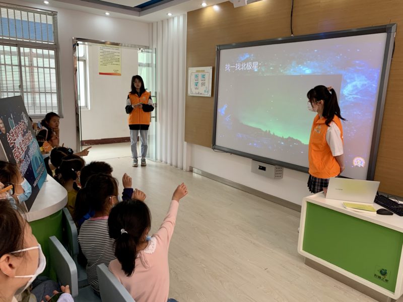 活动分为“瞧瞧我的小宇宙”、“寻找最亮的星星”、“学习《小星星》手指操”三个环节。志愿者通过一个视频,把大家带入了充满神秘奥妙的星海,小朋友们被繁星点点所吸引,无不惊叹宇宙的宏伟壮观。随后,志愿者带领大家畅谈自己平日里所见到的星空的模样,并生动形象地科普了卫星、行星、恒星、太阳系与银河系等名称,小朋友们也扮演起了月亮、地球和太阳,纷纷模拟起天体运动的轨迹。在游戏中很快就学习到卫星绕着行星转,行星绕着太阳转的知识。在大家最喜欢的“寻找最亮的星星”环节,志愿者让大家一起帮忙寻找夜空中最亮的一颗星星—北极星,星空图片里的星星和小朋友们动脑筋的小眼睛争相闪烁。孩子们在欢快的音乐节拍中乐此不疲。