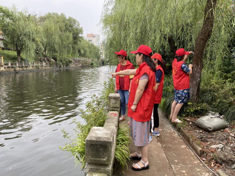 如城街道陆桥社区河长朱晓燕带领志愿者们到辖区外城河进行巡查,河道边污水排放源、坡道绿化、河边公厕污水井、杂物等,志愿者一边巡查、清理,一边认真做好记录。