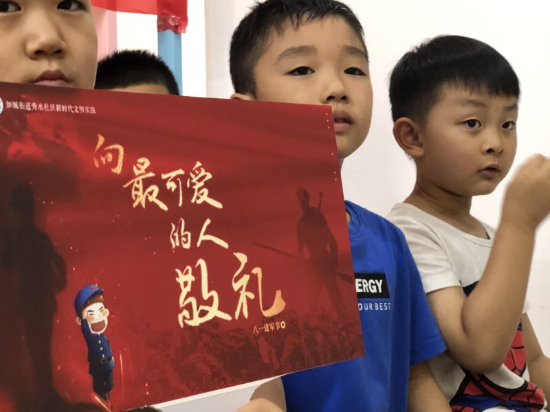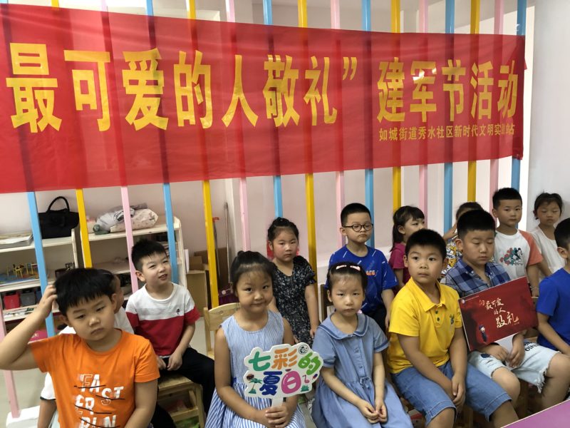 8月1日上午9点,如城街道秀水社区开展“向最可爱的人敬礼”八一建军节活动。邀请了退伍老兵以及刚退伍的大学生一起来给孩子们讲解当兵经历以及战争故事,希望孩子们发扬革命光荣传统,铭记历史,要有爱党爱国意识,珍惜今天的幸福生活,长大后全心全意为人民服务。