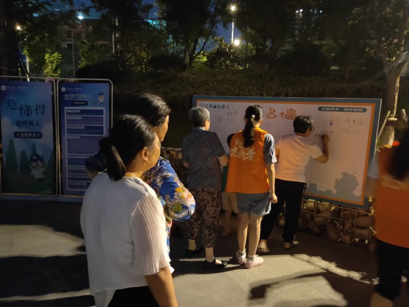 活动中,志愿者们向过往的居民发放《给居民的一封信》和《文明养犬须知》等宣传资料和牵狗绳等小礼品,告知他们“带宠物狗出门时,一定要带牵引绳、拾便器和垃圾袋,及时清理宠物便便,维护公共卫生环境,争做文明养犬人”,并现场解说文明养犬的重要性,现场共发放资料70余份,40多位居民在签名墙上签名。