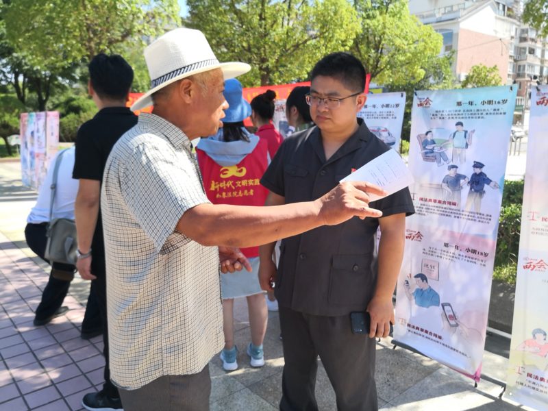 “法律小课堂”下课后,小伙伴们向过往群众发放民法典学习手册并提供法律咨询服务,对群众关心的物业合同、劳动争议等方面的法律问题答疑解惑。