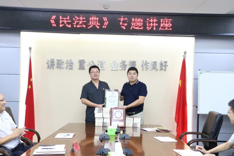 授课结束,向市委组织部贾华兵主任赠送《民法典》以及讲师团纪念徽章、纪念证书。据悉,此次活动是南通法院民法典讲师团开展的第229场《民法典》宣讲。