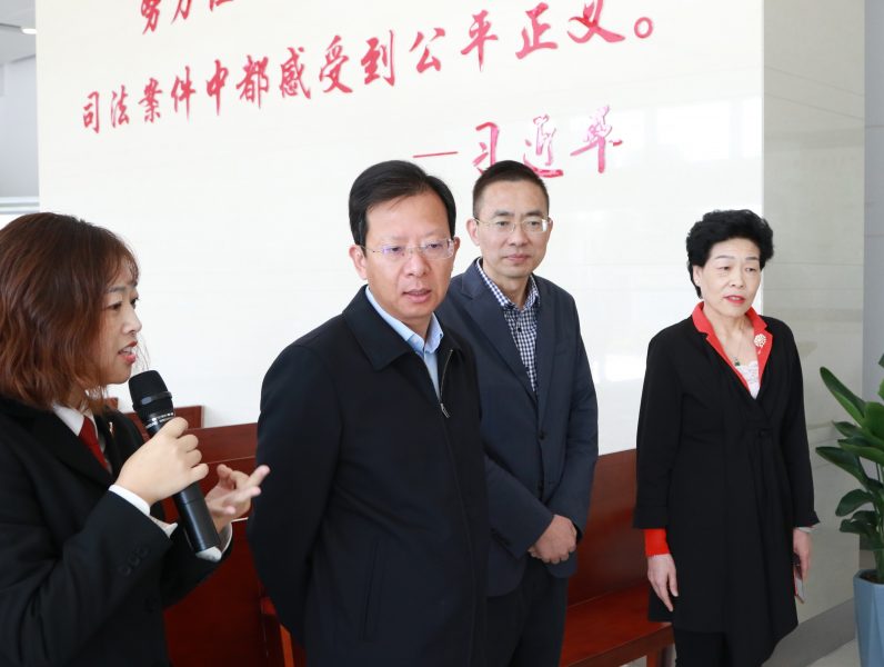 张建华书记参观了家事法庭的布局设置,详细询问了案件受理以及“法暖黄昏、法伴成长、法润芳华”司法服务驿站的工作开展情况。他要求,在家事纠纷化解工作实践中,一定要创新思维,走出法庭,与学校、妇联等相关单位合作,切实维护弱势群体的合法权益。