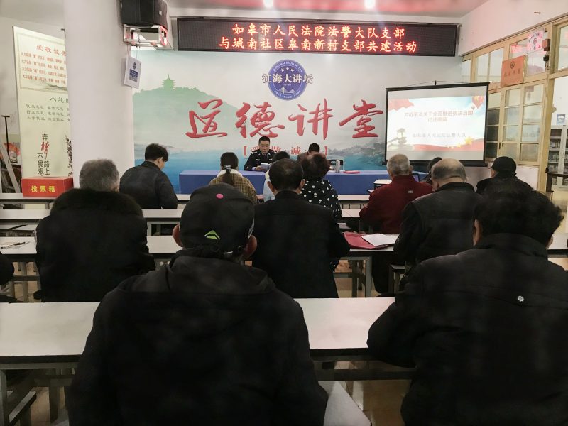 新如皋报讯 为进一步推进基层党组织建设工作,增强党组织凝聚力,实现党组织之间优势互补,近日,如皋市人民法院法警大队党支部联合城南社区皋南新村支部开展“普法宣传进社区”活动。