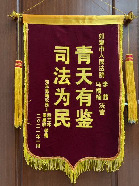 新如皋报讯 1月4日,元旦节后上班第一天,来自如东的两位农民工兄弟一大早就带着锦旗来到如皋法院,赠送给速裁庭李茜团队。