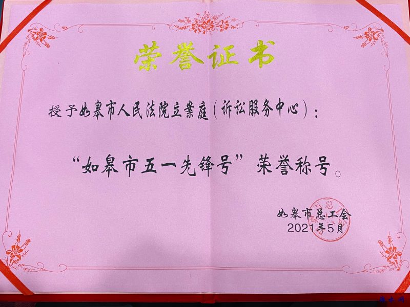 新如皋报讯 5月8日下午,在如皋市总工会召开的如皋市“五一劳动奖”命名大会上,如皋市人民法院立案庭(诉讼服务中心)被授予“如皋市五一先锋号”荣誉称号。