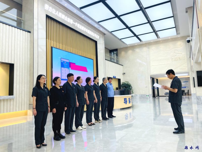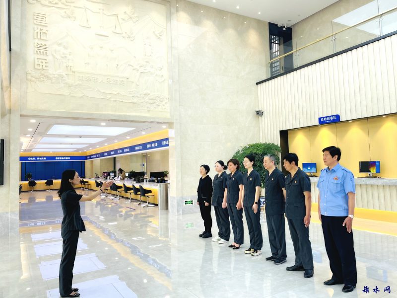 7点40分,诉讼服务大厅传来阵阵口号声“全体都有…立正…向左看齐…向前看!”。整队完毕后,马剑梅庭长介绍了晨训活动的具体实施方案并作动员讲话。