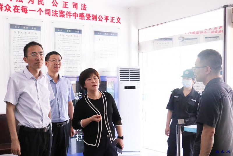 程瑞琴书记实地查看白蒲法庭的安检设备、庭审室、调解室,了解法庭现有的办公环境,并来到目前初定的白蒲法庭搬迁地址进行考察,查看原有基础设施状况。
