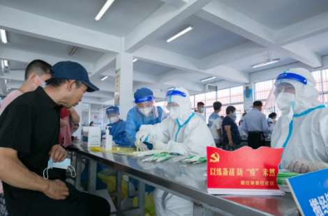 核酸检测采样现场,群众积极配合、有序排队;工作人员、志愿者们全力支援;医护人员身着密不透风的防护服与时间赛跑,加班加点开展采样工作。准备充足、组织有力。