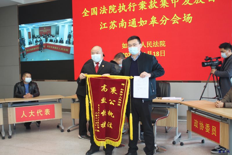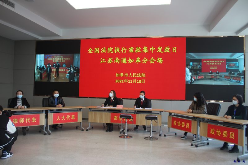 同一时间,最高法院召开新闻发布会,介绍执行领域突出问题集中整治阶段性进展暨全国法院执行案款集中发放日有关情况。活动以视频会议形式开展。如皋法院与江苏省法院(南京秦淮会场)进行视频连线,汇报本地区执行案款集中发放情况。