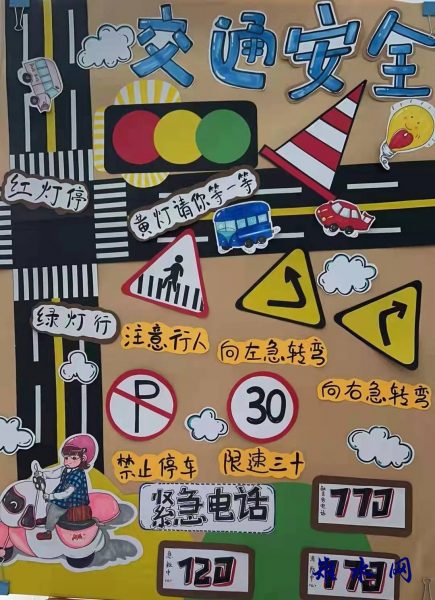 各班利用图片、儿歌、画画等多种形式,围绕主题对幼儿加强教育。老师还在幼儿园里还创设了十字路口、红绿灯等交通演练示意图,针对交通安全进行了情景表演模拟演练,从而提高幼儿的道路交通安全意识和自我保护意识。同时园内印发《安全文明出行—致中小学幼儿园学生家长一封信》,并收回回执单,确保人人知安全。