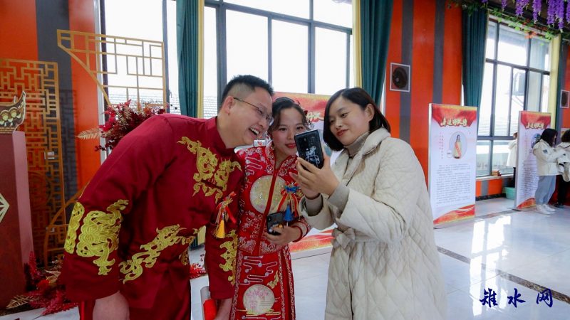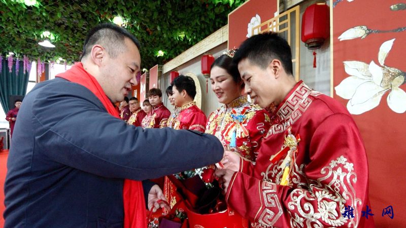 良辰吉时到,伴随着喜庆乐声,六对新人手牵手步入现场,接受大家的祝福和掌声。没有豪华车队,没有奢华酒店……但笑靥如花的新郎和新娘,成为下原镇一道亮丽的风景。