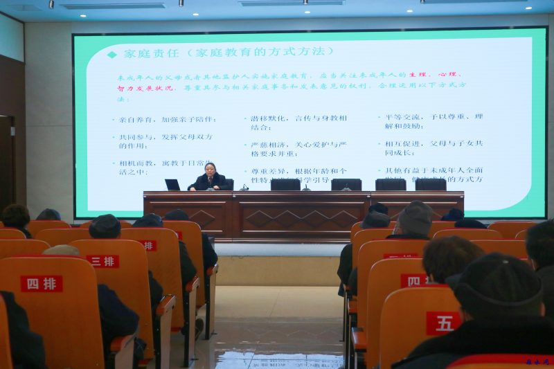 宣讲中,陈璇围绕家庭教育的内涵、总体要求、家庭责任、国家支持、社会协同、法律责任等多方面对《家庭教育促进法》进行了详细解读,引导家长重视家庭教育、切实履行家庭教育主体责任。她说,家长是孩子的第一任老师,家庭是孩子的第一个课堂,每一位家长都应用正确的教育方式对孩子进行培养。她还就家长未履行监护职责、家庭教育缺失时,应承担的法律责任进行了讲解。