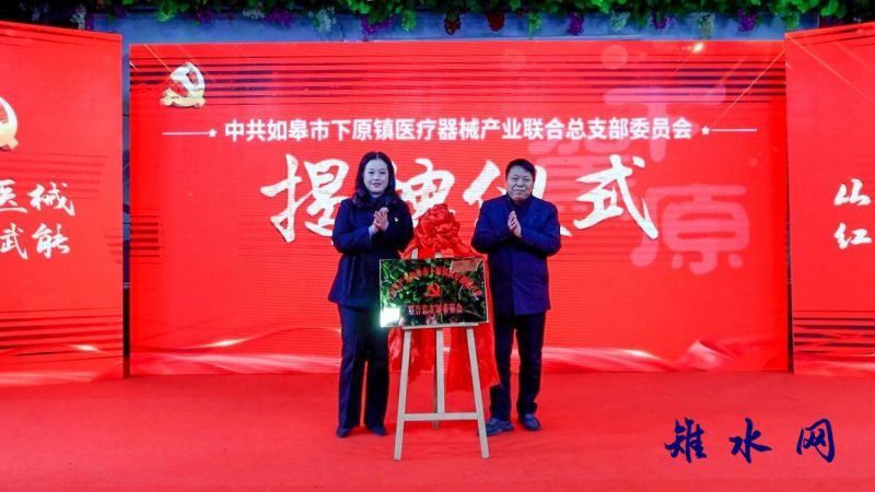 如皋市委常委、组织部部长、统战部部长朱莹滢与如皋市医疗器械同业商会会长、南通安琪医疗用品有限公司董事长邵贤斌,共同为如皋市下原镇医疗器械产业联合总支部委员会揭牌。