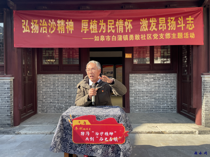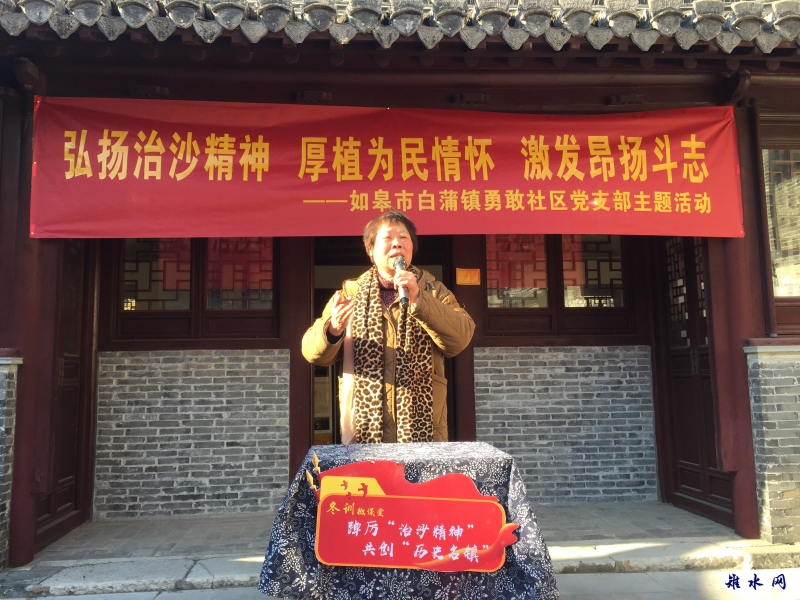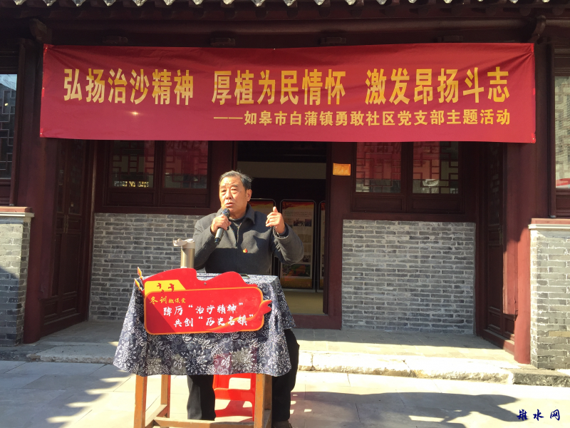 为广泛普及如皋人民治沙历程,弘扬传承如皋治沙精神,邀请白蒲镇历史文化研究会会长杨春和书记,为党员同志讲述治沙改土的故事。80多岁的他不仅是治沙改土的宣讲者,更是这段历史的见证者和参与者。如皋的高沙土治理是发生在上世纪七八十年代的一场“削平高沙土、实现旱(田)改水(田)”的革穷命、挖穷根的“土地革命”,是如皋人民赤膊上阵向沙土要水田、向沟洼要平地的抗天抗地抗沙抗低产的“全民抗战”。他说:“想想当年的治沙条件,那可不是用‘苦’和‘难’所能简单概括得了的。一是没装备,全靠人拉肩挑;二是时间紧,每年只能利用秋冬播种前两三个月,需要日夜不停抢季节;三是吃不饱,天天重体力活却只能吃萝卜饭、喝山芋茶;四是睡不香,非高沙土地区的几万民工打起背包,借住民房,麦秸一铺,席地而卧。我们是党的干部,更是群众的带头人。群众付出一分,党员就要付出更多,这样才能起好带头作用。治沙改土时,我们镇的群众是‘吃三休五干十六’,在我的带动号召下,党员干部都自觉地‘吃二休四干十八’。”