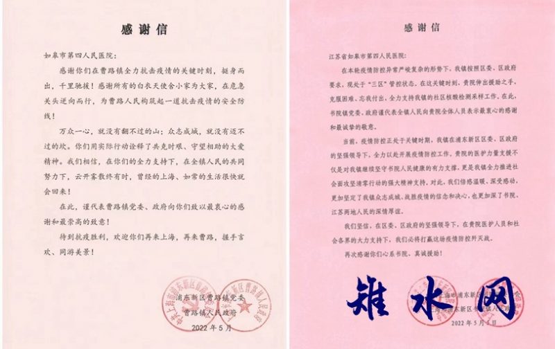 “感谢你们在曹路镇全力抗击疫情的关键时刻,挺身而出,千里驰援!感谢所有的白衣天使舍小家为大家,在危急关头逆向而行,为曹路人民构筑起一道抗击疫情的安全防线……”这是如皋市第四人民医院近日收到的第二封、来自上海的感谢信,信中字字真切,句句暖心,表达了对援沪医护人员的感激之情。
