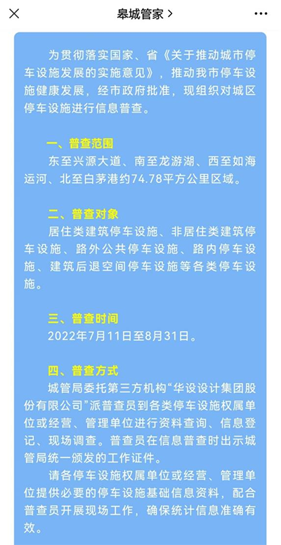 7月9日,如皋市城市管理局将本次停车设施信息普查的范围、对象、时间及方式向社会公布。