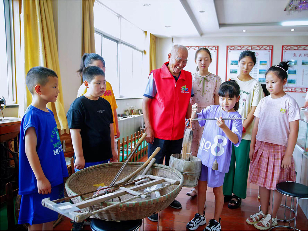 随后志愿者带领孩子们参观了社区村史馆,与孩子们一起畅谈家乡的发展史。“这个是干什么用的?我都没见过。”小家伙们探头探脑,或看或摸,非常好奇。