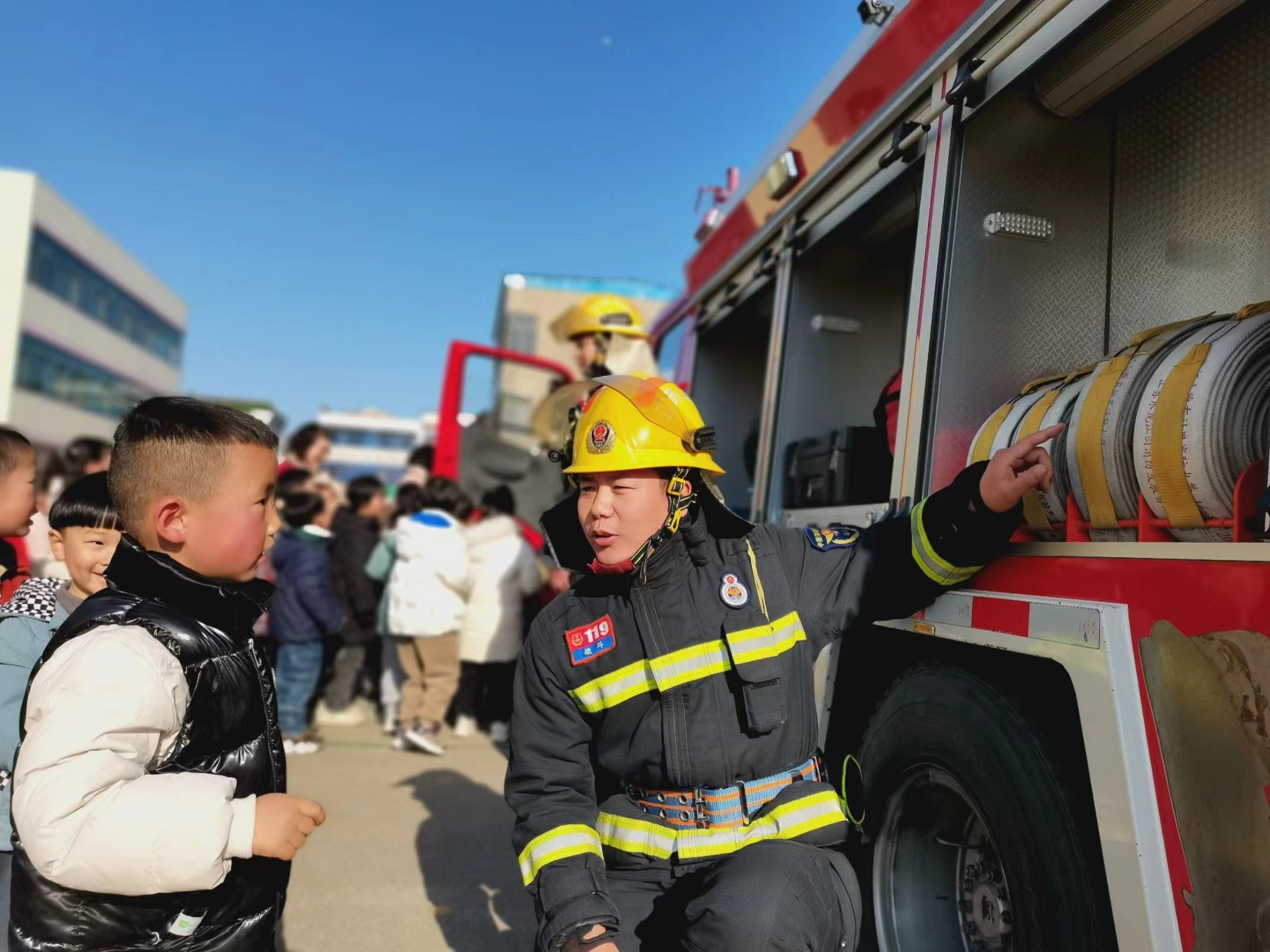 小朋友们在消防队员的带领讲解下,参观了消防车辆及各种器材装备。面对各式各样的器材,小朋友们都觉得很新奇,积极提出他们心中的疑问,消防员耐心给予解答,极大地激发了小朋友们“学习消防、参与消防”的热情。消防员们还向小朋友们演示了抱水枪灭火、爬绳,娴熟的动作,精湛的演示赢得了师幼们热烈持久的掌声及欢呼声。消防员叔叔叮嘱小朋友们在学习中、生活中要主动学习消防知识,真正做一名合格的“小小消防员”。