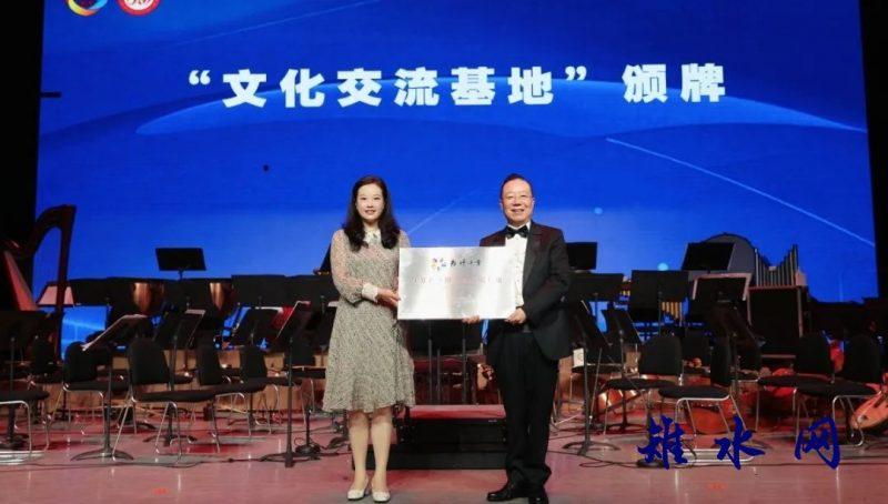如皋市委常委、统战部部长、组织部部长朱莹滢为获评“江苏省华侨文化交流基地”的江苏新空间民族管弦乐团授牌。