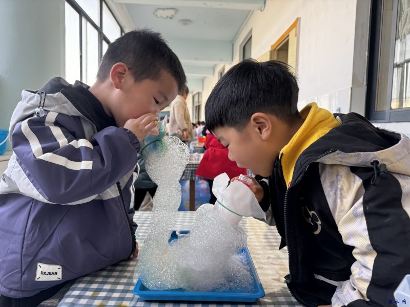 孩子们齐聚多功能厅,以“空气炮”的有趣玩法拉开序幕,现场互动氛围积极活跃。各班以图片、视频的方式对本次活动进行了分享、总结,孩子们化身小小解说员,从实验材料的准备、操作步骤到原理,有条不紊地讲解自己喜欢的科学小实验。同时各班还精心准备了丰富多彩的科学实验:非牛顿流体、茶颜悦色、站立的牙签、电路实验等,吸引着孩子们的好奇心,孩子们参与其中,探索科学的奥秘。