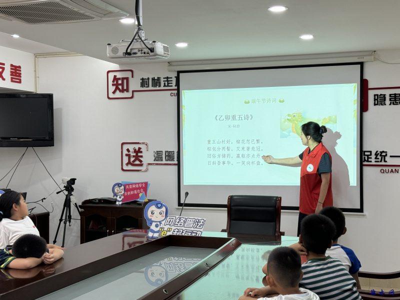 “重五山村好,榴花忽已繁。粽包分两髻,艾束著危冠。”活动开始,志愿者通过一首《乙卯重五诗》,带领孩子们从诗词中了解端午的历史、品味端午的习俗、感受端午节丰富的文化内涵“有人知道还有哪些跟端午有关的诗词吗……”“好酒沈醉酬佳节,十分酒,一分歌。”“不效艾符趋习俗,但祈蒲酒话升平。”“节分端午自谁言,万古传闻为屈原。”……孩子们纷纷举手,踊跃发言。