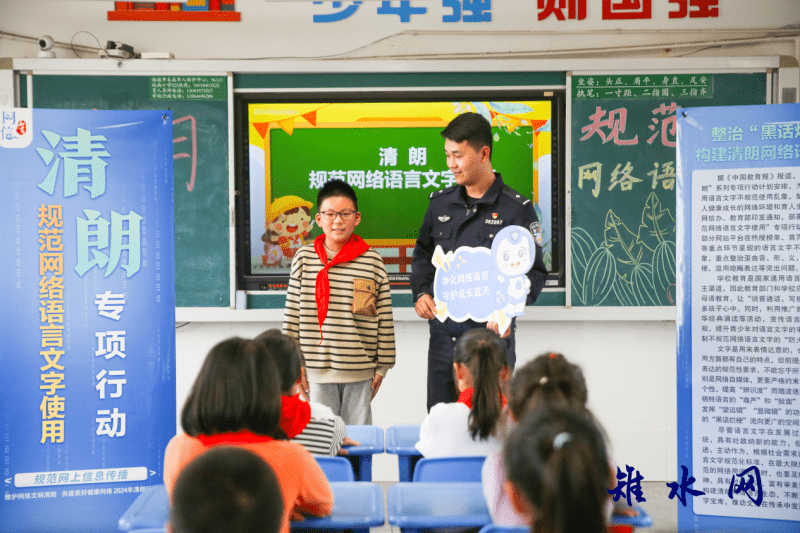 “同学们,你们有没有听说过网络黑话或者烂梗?能给我举几个例子吗?”“大家知道这些网络用语是什么意思吗?”高新区派出所民警耐心地向学生们解释了网络语言的利与弊,并通过互动问答的方式,让小学生们参与到整治“黑话烂梗”讨论中来。通过提问,引导学生们思考这些用语背后可能隐藏的负面含义,并鼓励他们远离这些不健康的网络文化。