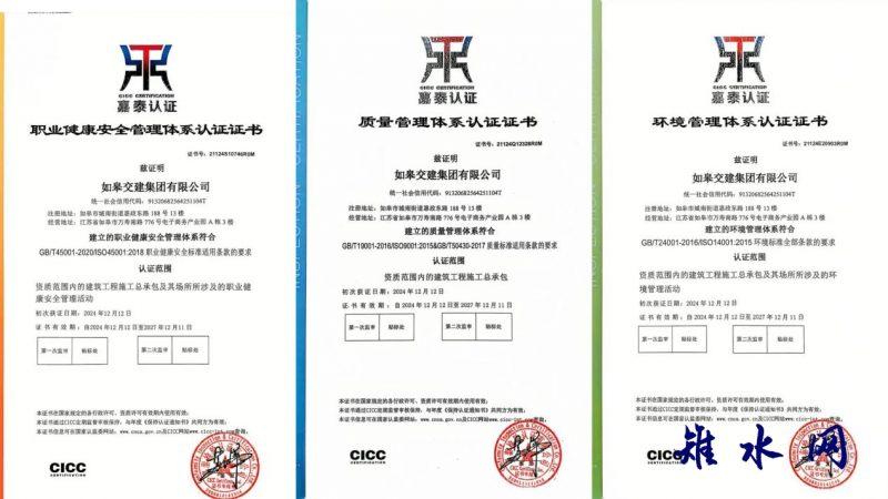 新如皋报讯 近期,如皋市交通产业集团下属子公司如皋交建集团有限公司成功通过ISO9001(GB/T50430-2017)质量管理体系、ISO14001环境管理体系以及ISO45001职业健康安全管理体系的“三体系”认证。