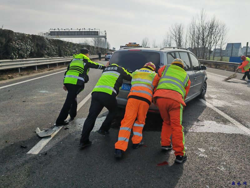 现场人员都安置到安全区域后,根据春运期间“一路三方”事故快处程序,沿海支队第四大队执法人员与车主进行了现场沟通,让损坏不严重的车辆自行驶离行车道,其中一辆损坏严重无法启动的车,由执法人员将该车推至紧急停靠带内。现场事故车辆撤离后,执法人员指挥积压车辆快速通行,不到十分钟便恢复了现场路网畅通。