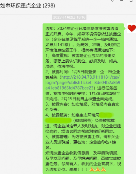 如皋局正式启动企业环境信息依法披露工作来,对2024年度披露企业名单进行核准,重新确定企业联系人,并逐一对接将141家企业无一遗漏邀请加入环保重点企业工作群。为高效、准确、及时推进环境信息披露工作,局领导带头认真学习信息披露文件精神,并要求将披露文件关键内容发至工作微信群,让企业认识到信息披露的必要性、重要性。“锚定”企业填报“责任”,明确告知企业公开是必须动作没有商量余地,而且必须及时、准确完成,企业应高度重视法定义务,必须如实披露。对环境信息弄虚作假、违法违规的行为将依法处理,从思想认识上提升企业披露的重要性。