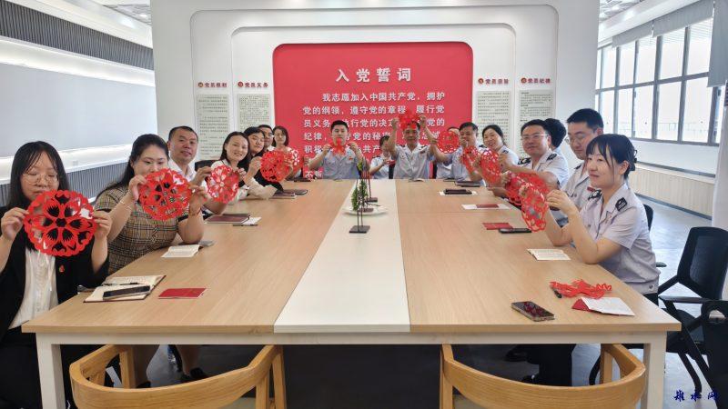 “莲花剪纸”实践活动将廉洁教育推向高潮。党员们手持剪刀,围绕“出淤泥而不染”的莲花图案精心创作。一片片镂空的莲叶、一朵朵立体的莲花跃然纸上,既展现传统非遗技艺魅力,更让“清廉如莲”的理念通过手工实践入脑入心。税务干部与教师们相互交流剪纸技巧,在协作中增进情谊,实现“艺术润廉”与“共建联心”的双重成效。