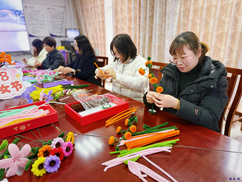 活动现场暖意融融,志愿者有序分发色彩斑斓的扭扭棒材料,耐心讲解弯折、缠绕、组合等制作技巧。各族妇女同胞兴致盎然、相互请教,一根根普通的扭扭棒在巧手下变幻出百合花、向日葵、柿柿如意枝条等精致造型,欢声笑语间拉近了彼此距离。