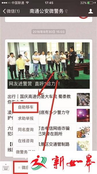 10月12讯 南通市民可关注“南通公安微警务”,微信公众号内就有自助移车服务。