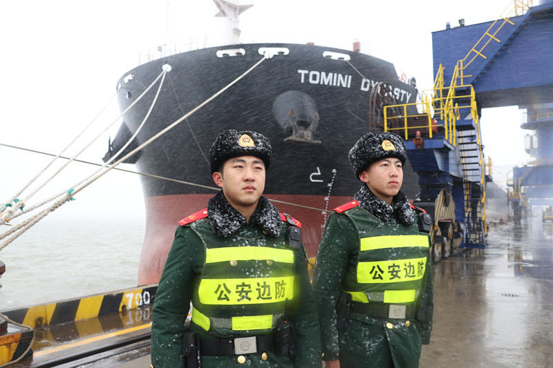 1月25日,江苏省气象局发布严寒橙色冰雪预警。常熟边防检查站所处的长江边大雪纷飞、滴水成冰、风如刀割。但边防战士准时到岗开始工作,描绘了一幅别样的边防风景。(周海飞 陈培瑜)